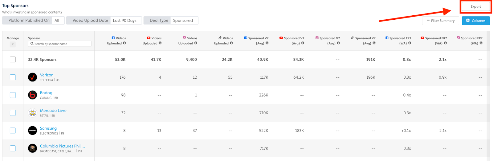 Sponsored V3, 7, 30 (Sum, Avg.): Total views a sponsored video received after the first 3, 7, 30 days | Average views a sponsored video receives after the first 3, 7, 30 days